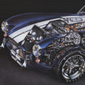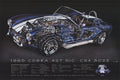 Additional Details: Poster advertisement for the 1965 Shelby Cobra featuring an exploded view focusing on the engine components as well as the frame and interior.
