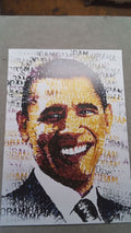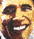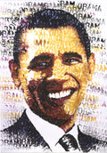Additional Details: This limited edition print of Obama by Chris Britz is signed and numbered by the artist, produced in an edition of 175. Printed on high-quality 300-gram paper, the artwork showcases Britz’s distinctive technique. His style involves the repetitive use of colored stamps, where the word "Obama" and other elements are stamped in varying hues. Up close, viewers can observe each individual stamp imprint, but as they step back, the collective marks form a striking portrait of President Obama. This unique approach merges the meticulous detail of each stamp with an optical effect, creating a powerful image of Obama that emerges through repetition and abstraction. The print is a bold example of how Britz uses text and form to create larger-than-life imagery, blending typography and portraiture in an innovative way.