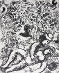 Additional Details: This original lithograph by Marc Chagall, titled "The Pair in a Tree," was published in 1963 as part of The Lithographs of Chagall, Volume I. The artwork, printed by Mourlot and Draeger, was published by André Sauret. Catalogued as Mourlot 397 and Cramer 56, it appears on page 129 of Chagall Lithographs, 1957-1962. The lithograph features Chagall and his beloved wife Bella embracing under a tree, with Chagall donning his characteristic hat. The piece beautifully captures their enduring love, a recurring theme in Chagall’s work, using whimsical and surreal imagery. The tree, often a symbol of life and continuity, adds to the sense of intimacy and dreamlike quality typical of Chagall’s compositions. The monochrome palette enhances the simplicity and emotional depth of the scene, making it a cherished work for collectors.