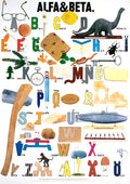 Additional Details: This children's educational poster, titled "Alfa & Beta," presents the Swedish alphabet with each letter accompanied by an illustration of an object or animal whose name starts with that letter in Swedish. For example, the letter 'D' is paired with an image of a dinosaur, corresponding to the Swedish word "dinosaurie." Such posters are designed to make language learning engaging and fun for young learners.