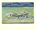 Additional Details: This lithograph titled Varengeville No. 2 by Georges Braque, published by Arte in Paris, France, is a serene depiction of a wooden plow resting in the middle of a field. Varengeville No. 2 captures a moment of calm after years of labor, with a wooden plow resting in a field. Braque uses soft hues of green and yellow to depict flowers scattered across the field, contrasting with the dark sky that suggests an impending shower. This interplay of colors and elements reflects the cyclical nature of work and rest in the agricultural landscape. The depiction of the plow, an essential tool for farming, symbolizes hard work and the passage of time.