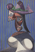 Additional Details: This is a reproduction of Bust of a Woman Wearing a Striped Hat was painted by Pablo Picasso in 1939. This work is from his Surrealist period, during which he explored distorted forms and psychological depth, often reflecting the turmoil of the Spanish Civil War and World War II. Part of his "Taschen Posterbook: Picasso" portfolio, published in 1993 by Taschen and printed in Germany.