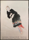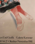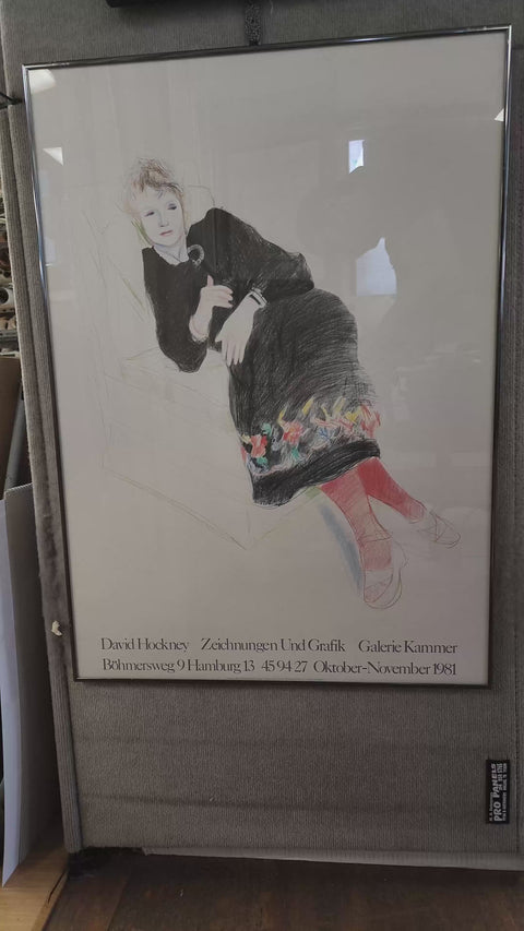Additional Details: This exhibition poster "Portrait of Celia in a Black Dress with Colored Border" designed and created by David Hockney for a show held at the Galerie Kammer in Hamburg, Germany in 1981, is a noteworthy piece that highlights Hockney's artistic prowess and his enduring relationship with his muse, Celia Birtwell. Celia is seated, exuding a sense of elegance and calm. Her black dress contrasts with the lively, colorful border, emphasizing her figure and drawing attention to her poised demeanor. The poster is in a gunmetal gray frame, which has a front face of 1/2 inch and a side profile of 1 inch.