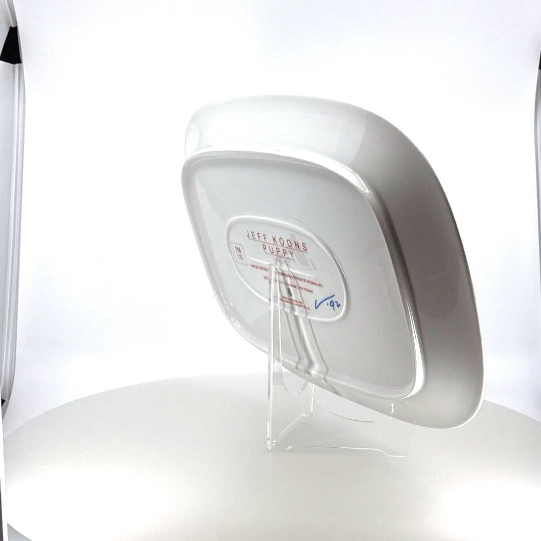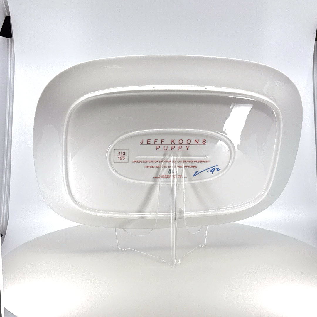 This "Puppy Platter" by Jeff Koons, created in 1992, is a special edition piece for the San Francisco Museum of Modern Art. Limited to an edition of 125, this enamel on porcelain platter was made in Switzerland by Langenthal. Although it is not signed, each platter is numbered out of 125 on the verso.