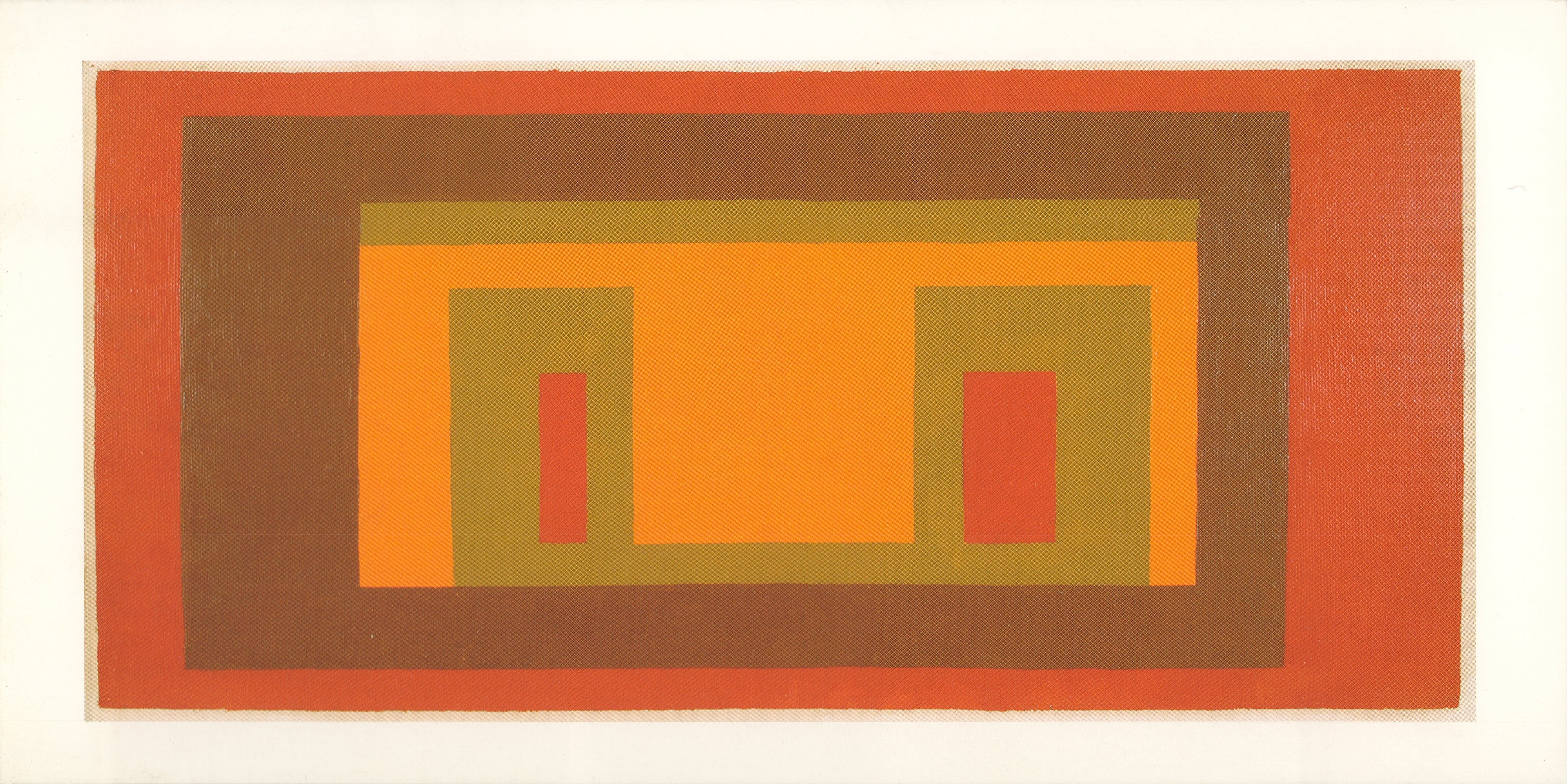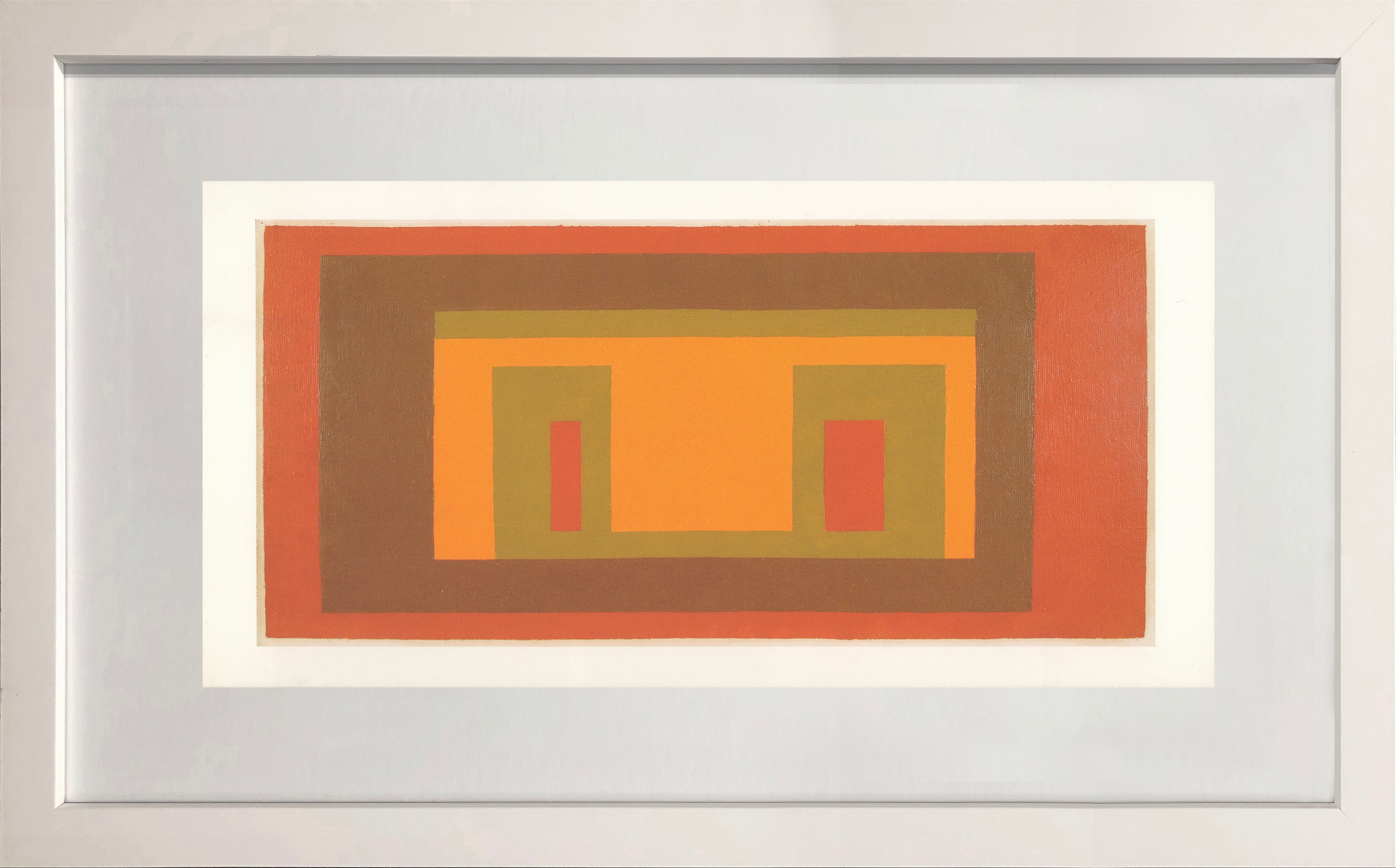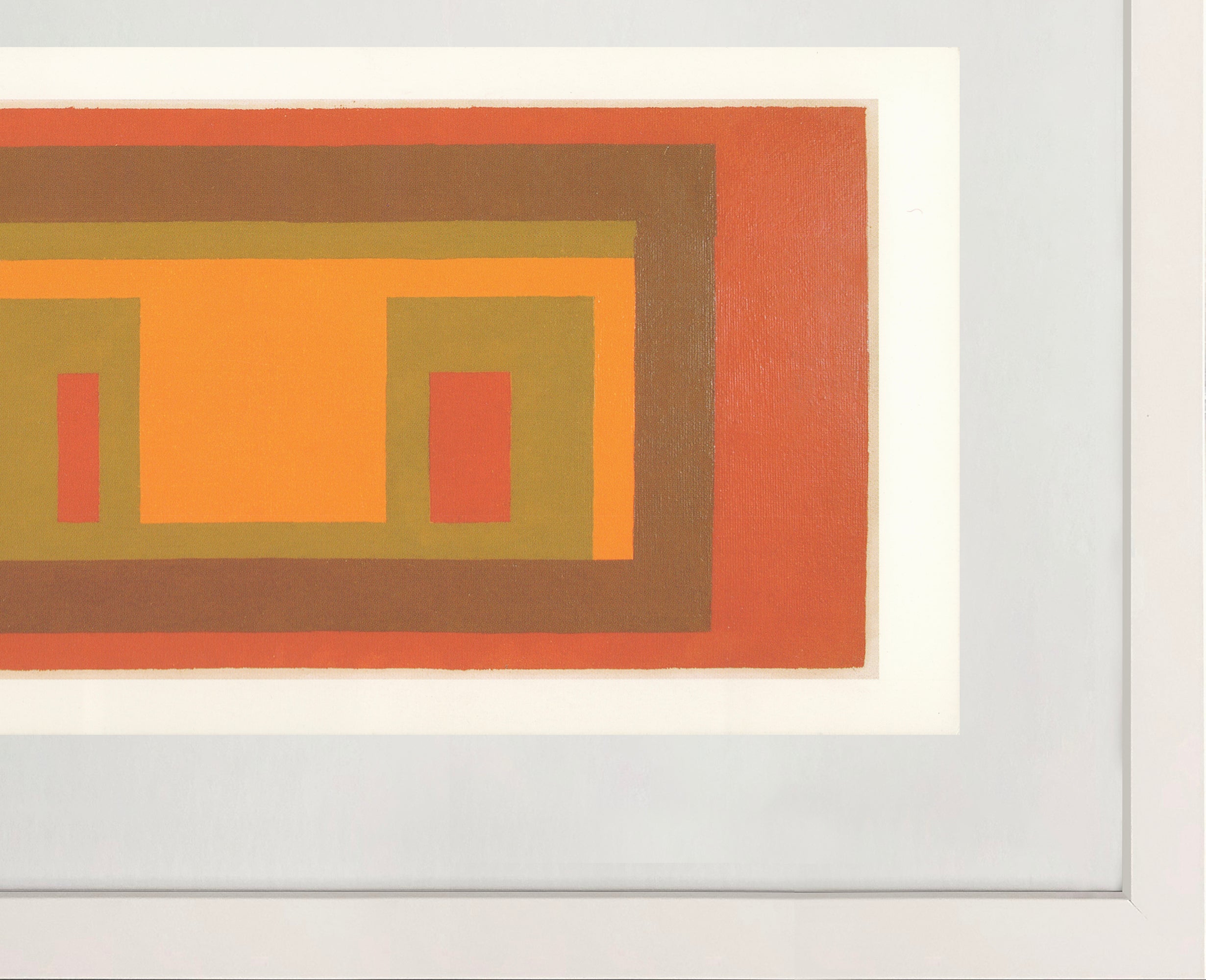 The front of the card features Albers’ Variant, a striking example of his exploration of color relationships and spatial perception. Composed of nested geometric forms in warm tonal harmonies, the work reflects Albers’ lifelong investigation into how color interacts, shifts, and defines structure. On the verso, the card presents Ken Price’s Pink Interior, offering a compelling dialogue between Albers’ disciplined geometric abstraction and Price’s more organic, sculptural sensibility.