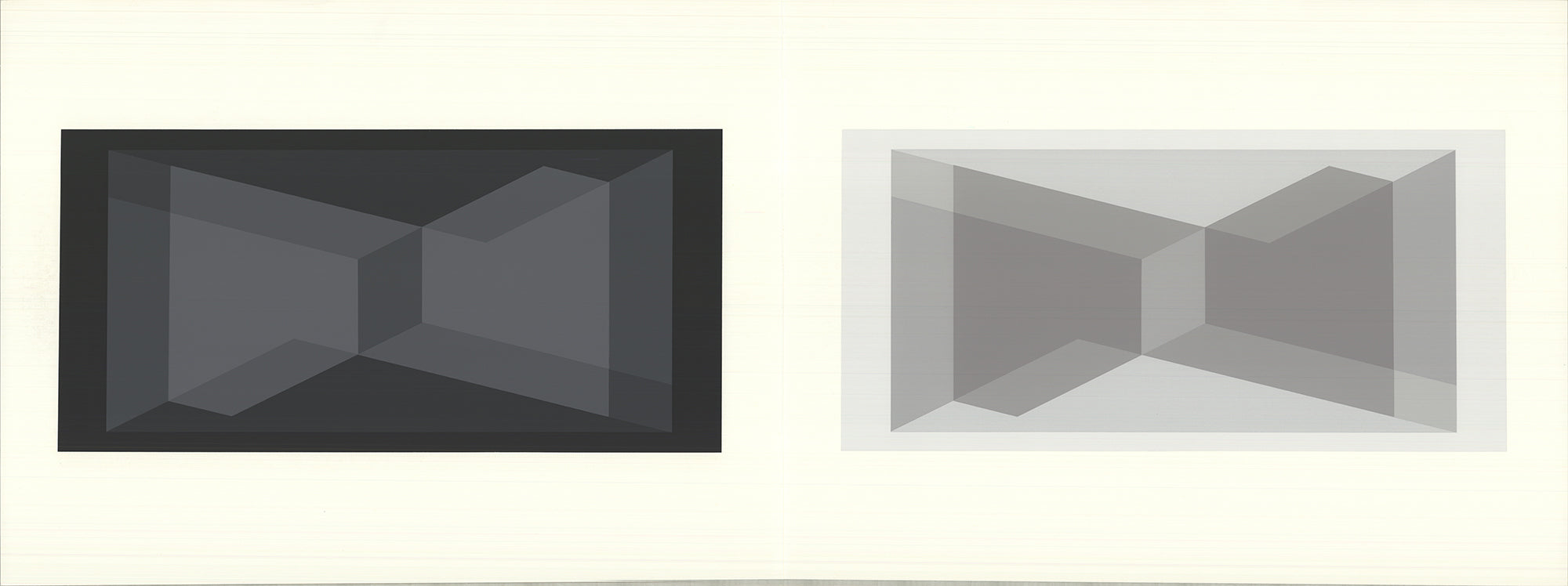 This double-page silkscreen print is part of a portfolio book featuring 127 of Josef Albers' most iconic works. Published by Harry N. Abrams in 1972 and printed by Albers' Yale colleagues, Norman Ives and Sewell Stillman, the portfolio was released in a limited edition of 1,000. The print, with a fold line down the center as issued, showcases Albers' mastery in color theory and geometric abstraction. Known for his "Homage to the Square" series, Albers' work in this portfolio highlights his innovative approach to exploring the interaction of colors and forms, making it a valuable piece for collectors and enthusiasts.
