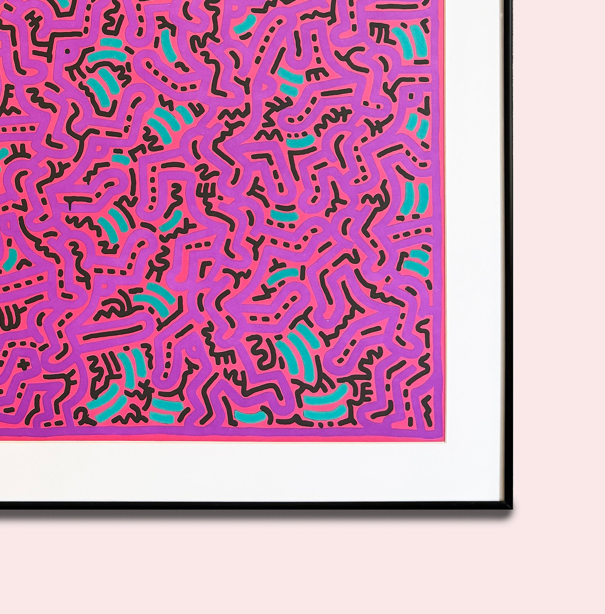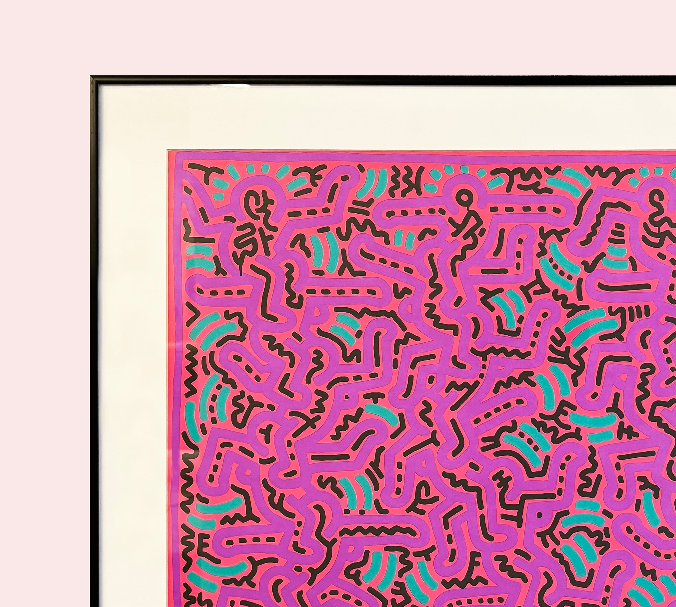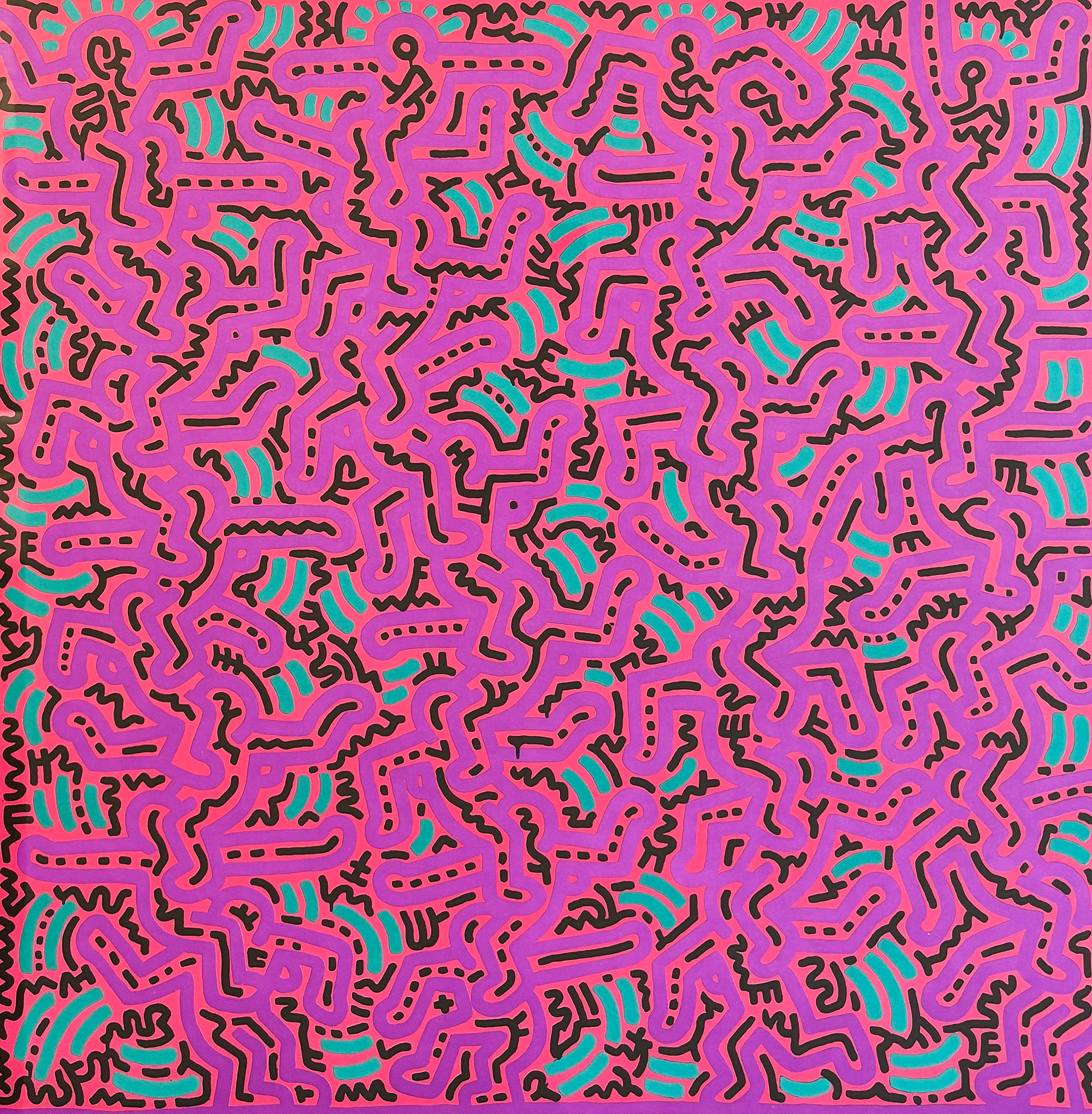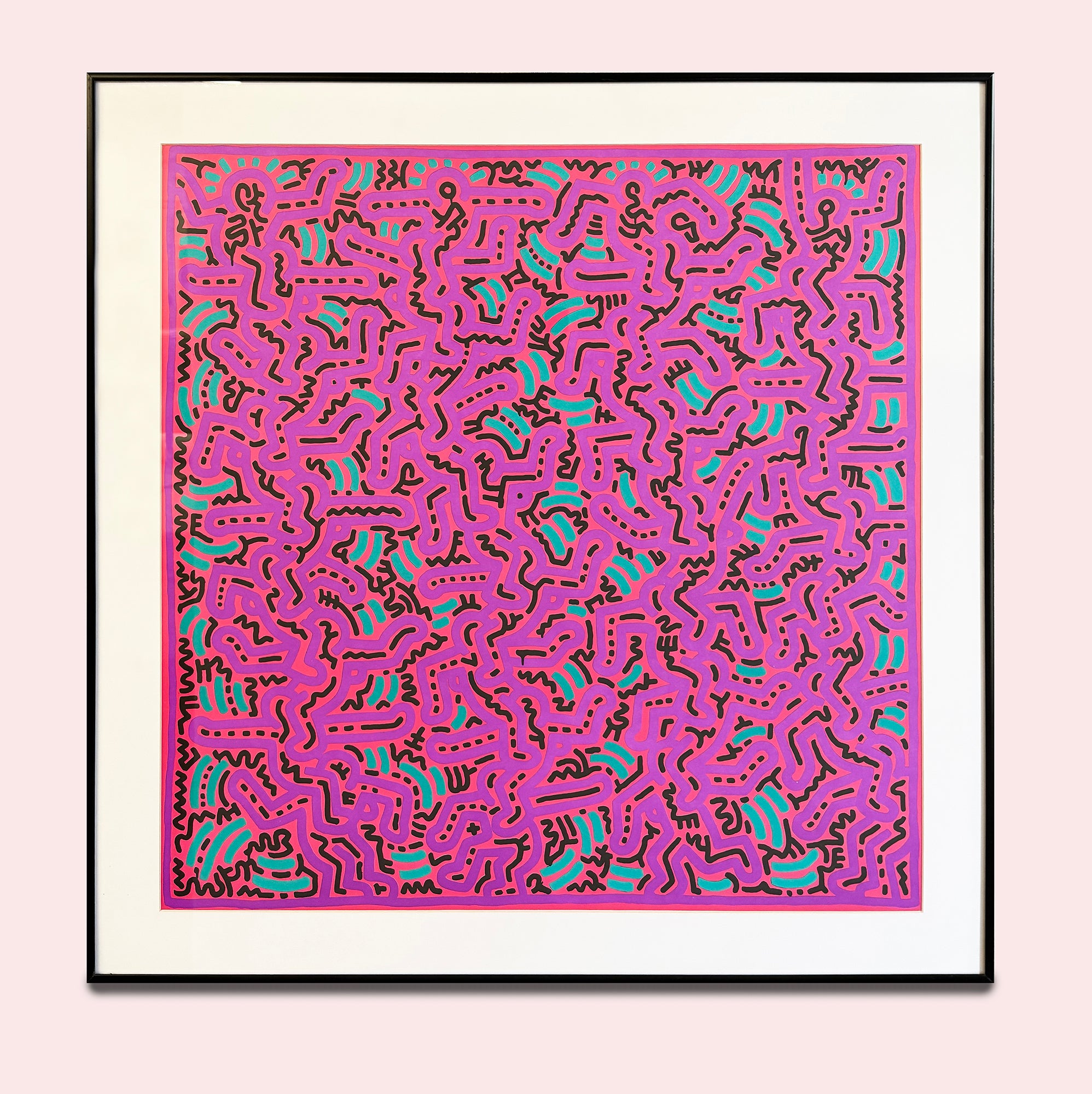 This vibrant and energetic composition reflects the unmistakable visual language associated with Keith Haring, one of the most influential artists of the late 20th century. The image is filled edge-to-edge with interlocking, animated figures, rendered in bold, continuous black lines against a vivid pink ground.