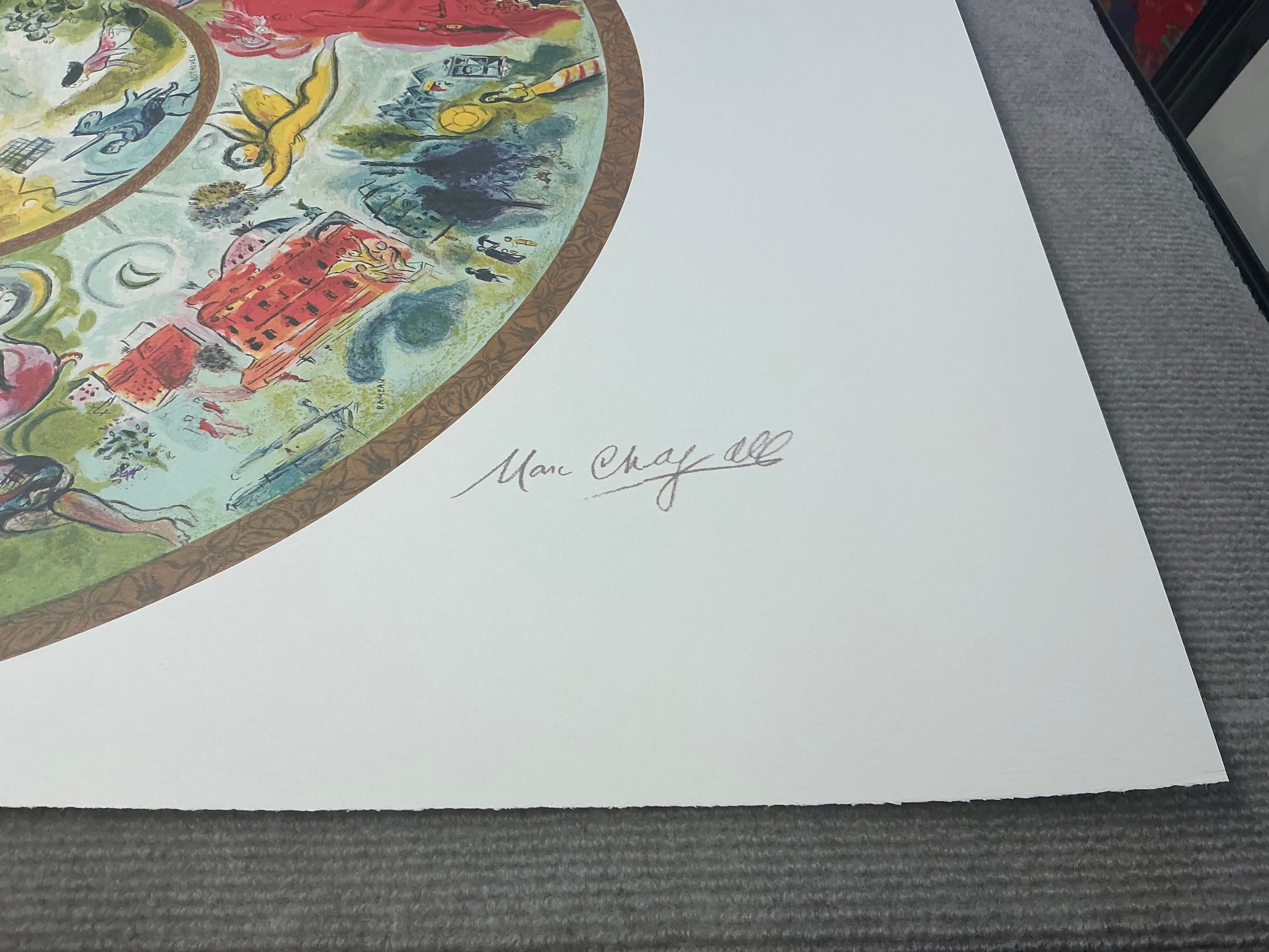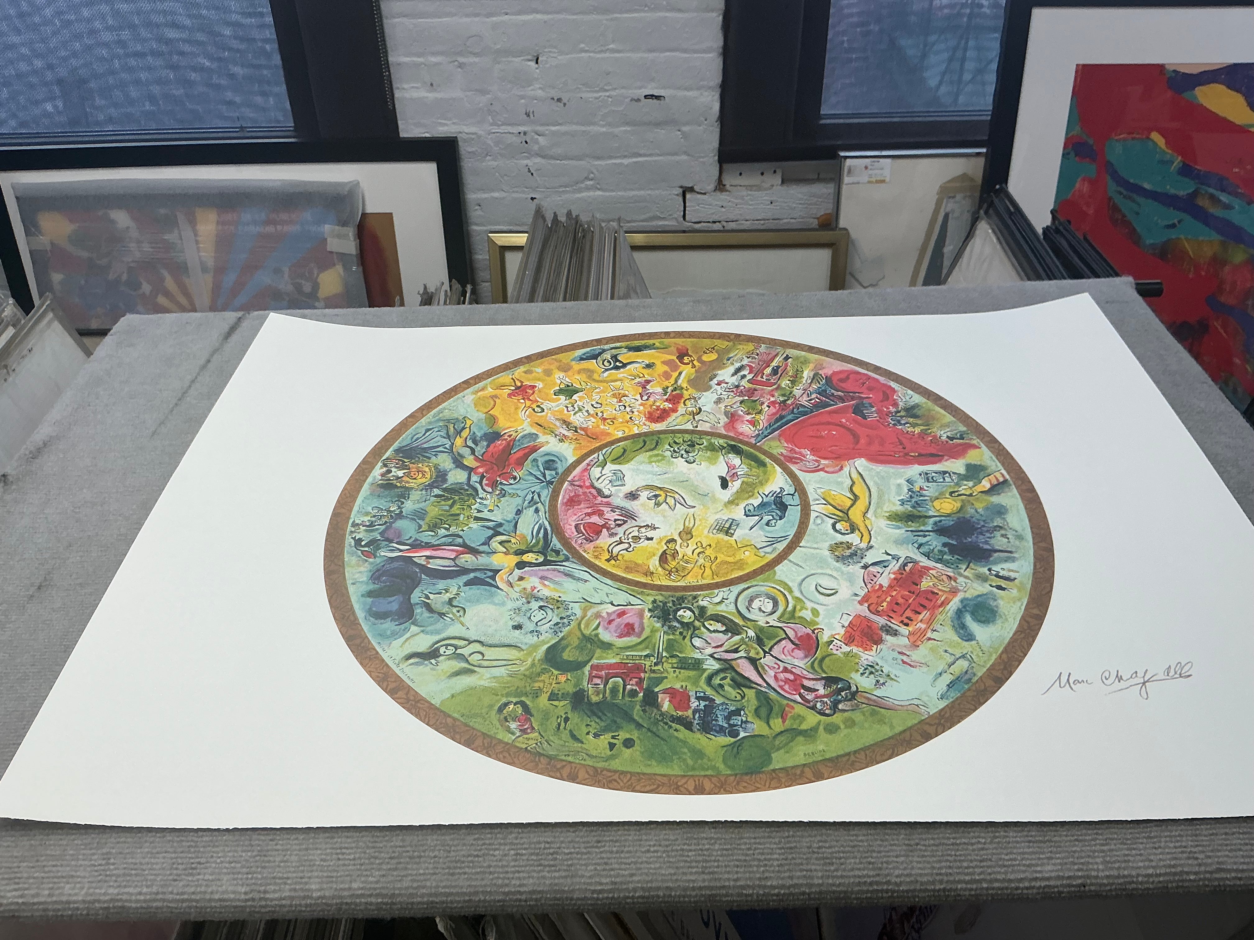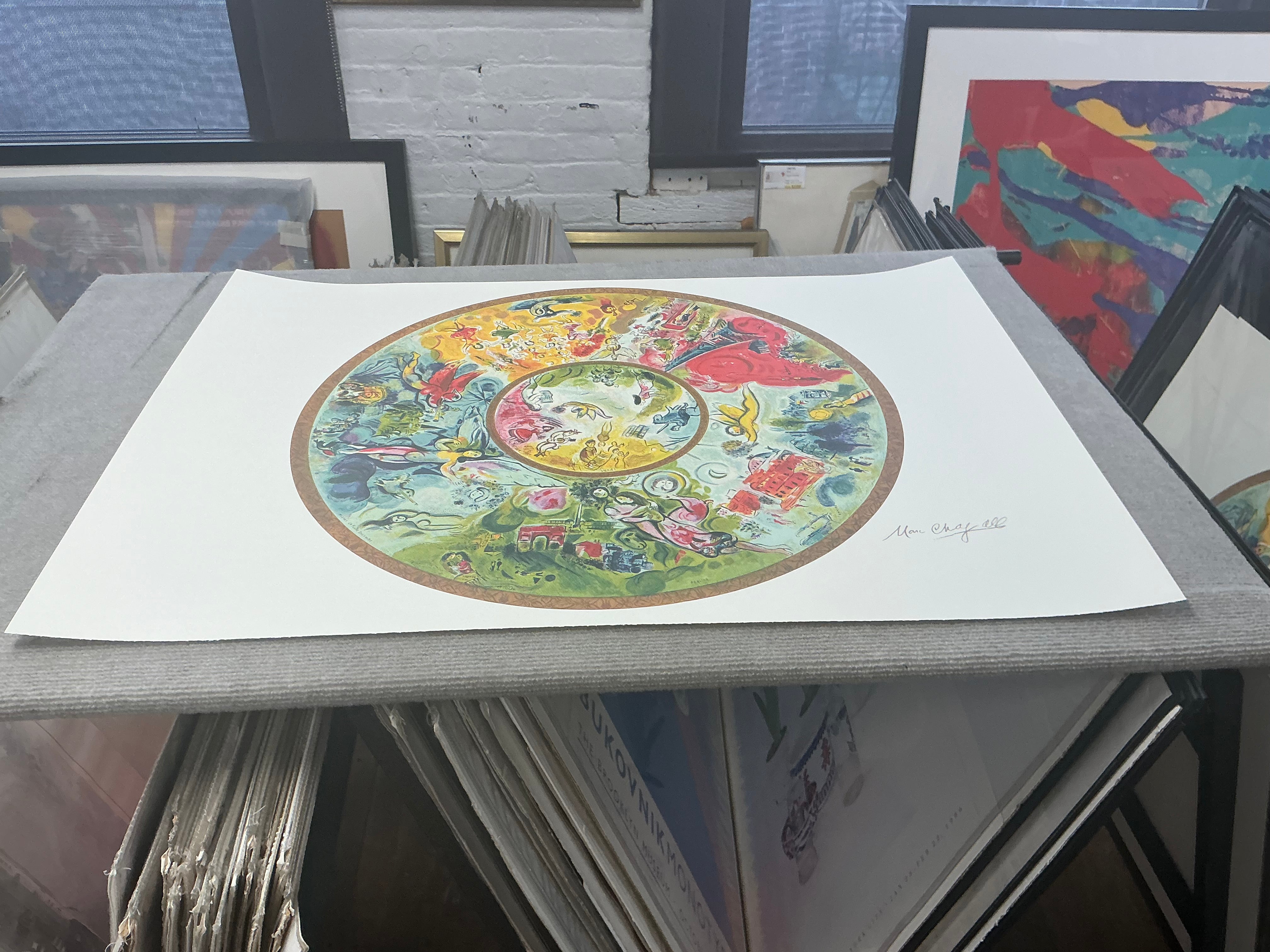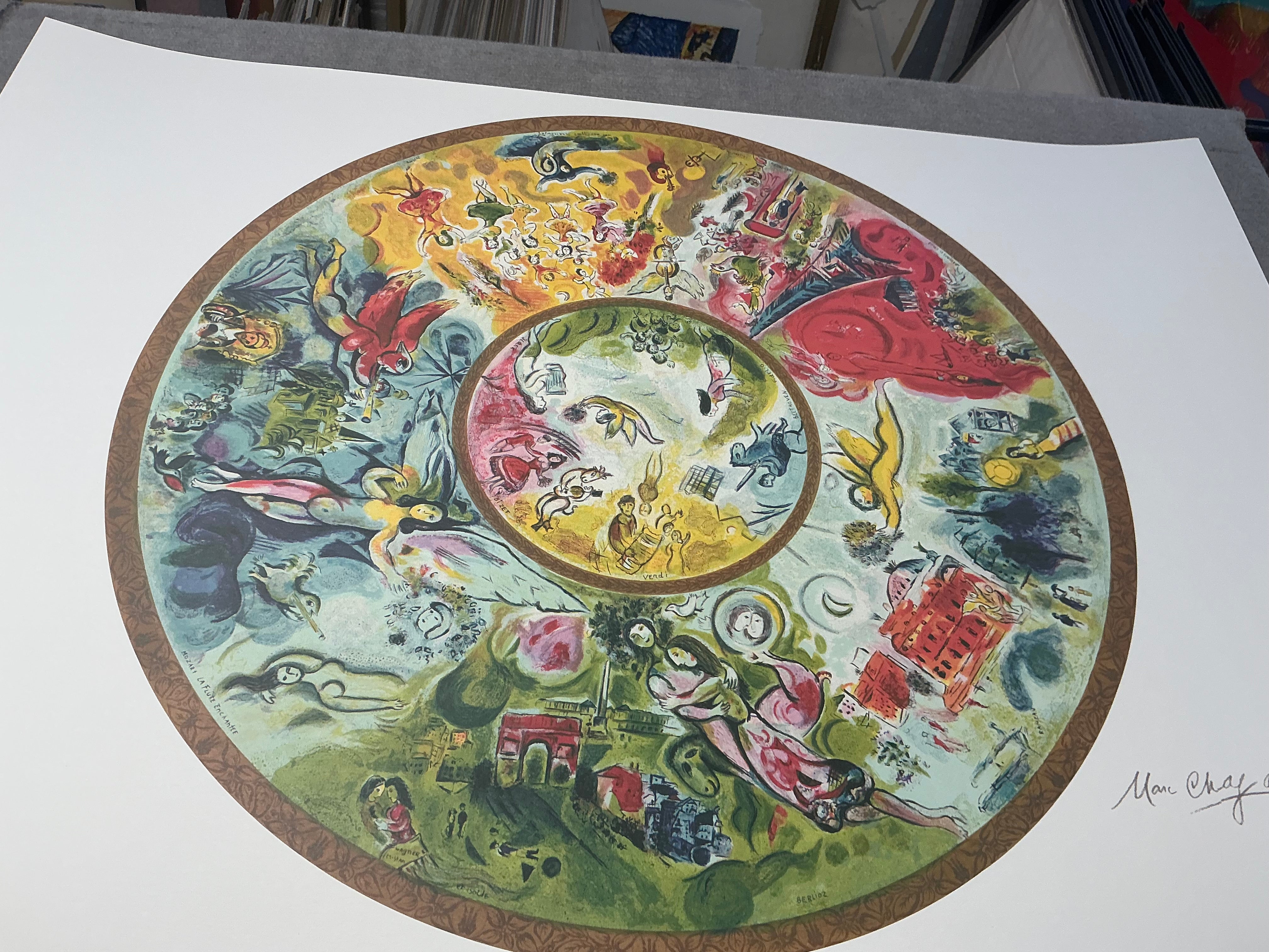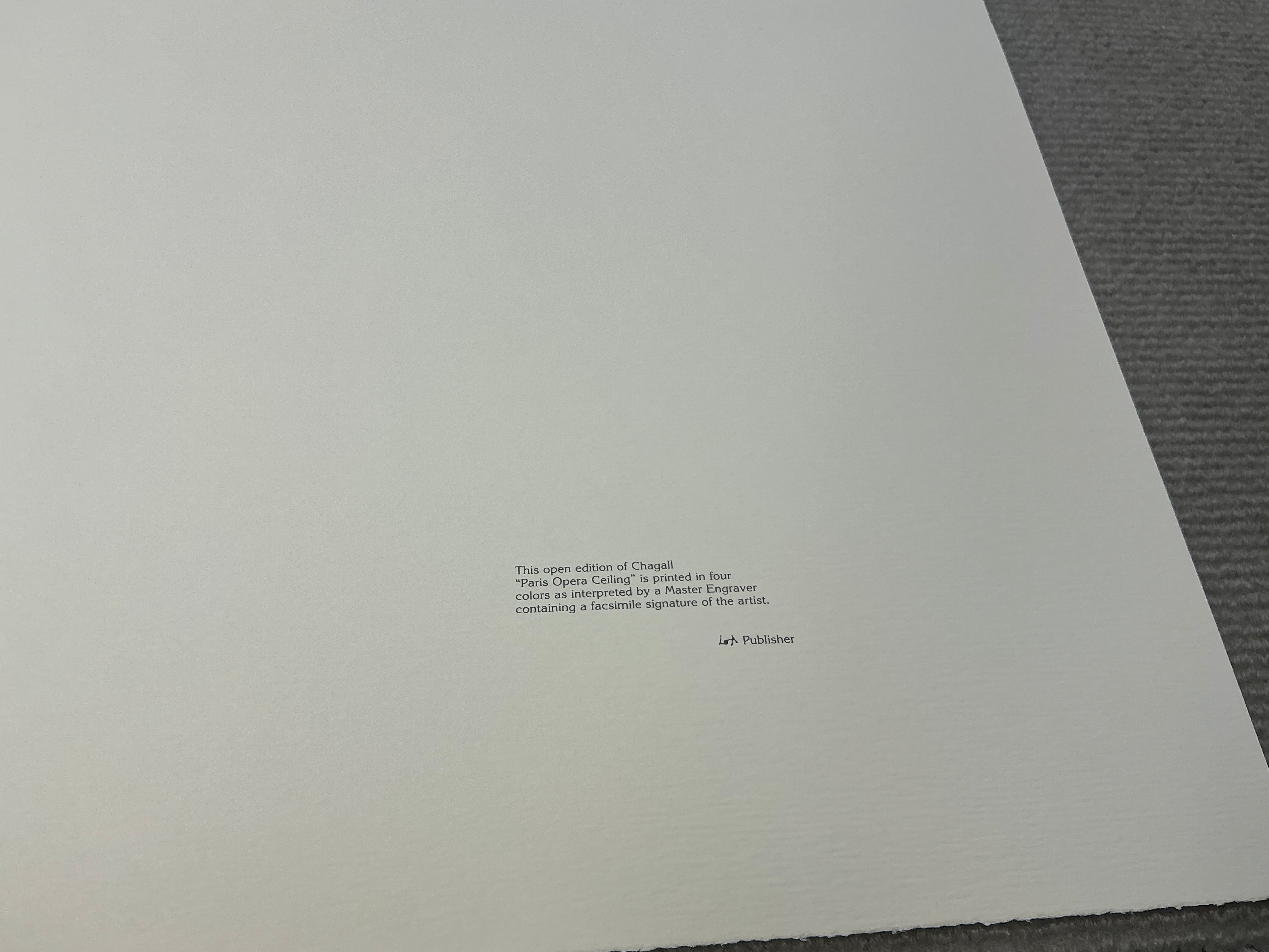 This five-color offset lithograph, featuring a facsimile signature of Marc Chagall, masterfully captures a vibrant detail from his iconic Paris Opera ceiling. Printed on high-quality Hahnemühle printmaking board, the lithograph showcases bright, vivid colors that highlight the dynamic and whimsical elements of Chagall’s original mural. The piece stands out for its intricate rendering and rich color palette, beautifully conveying the energy and fluidity of the mural’s design. It’s a stunning representation of Chagall’s artistic vision, making it a valuable and striking addition to any art collection, and a lasting tribute to his legacy.