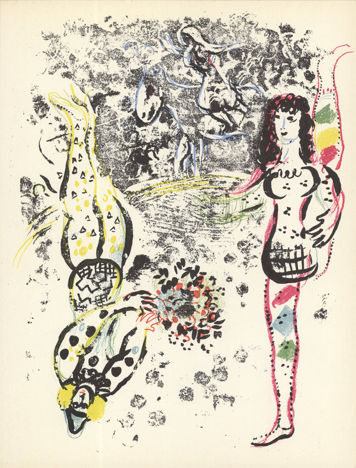 This first edition lithograph titled Acrobatics comes from Chagall's Lithographs Volume II and is catalogued as Mourlot 401. Printed in 1963 by the prestigious Mourlot Frères atelier in Paris, this lithograph embodies the magic of Chagall’s whimsical universe. Known for working with the most celebrated modern artists, Mourlot ensured exceptional quality in bringing Chagall’s vision to life.