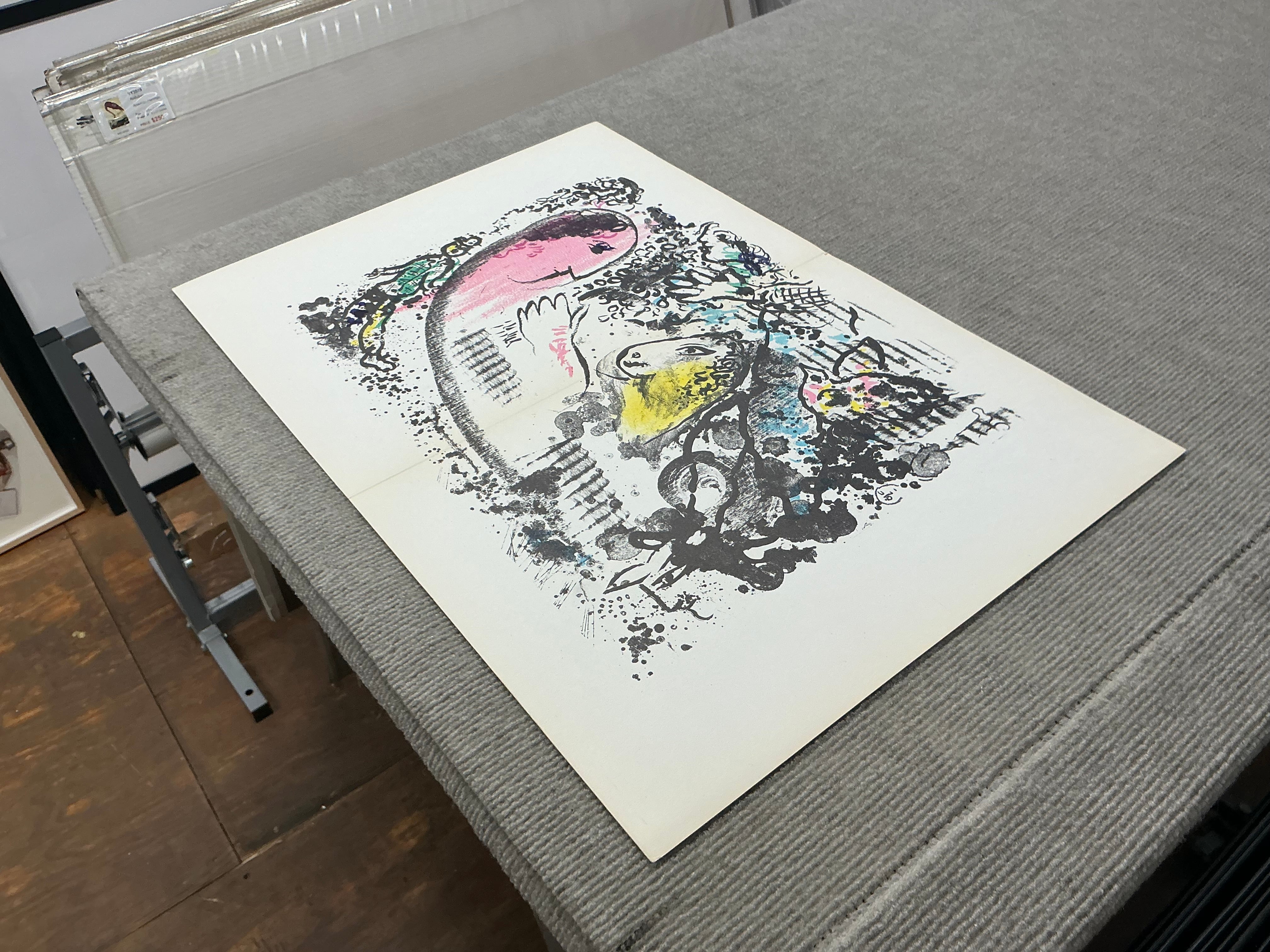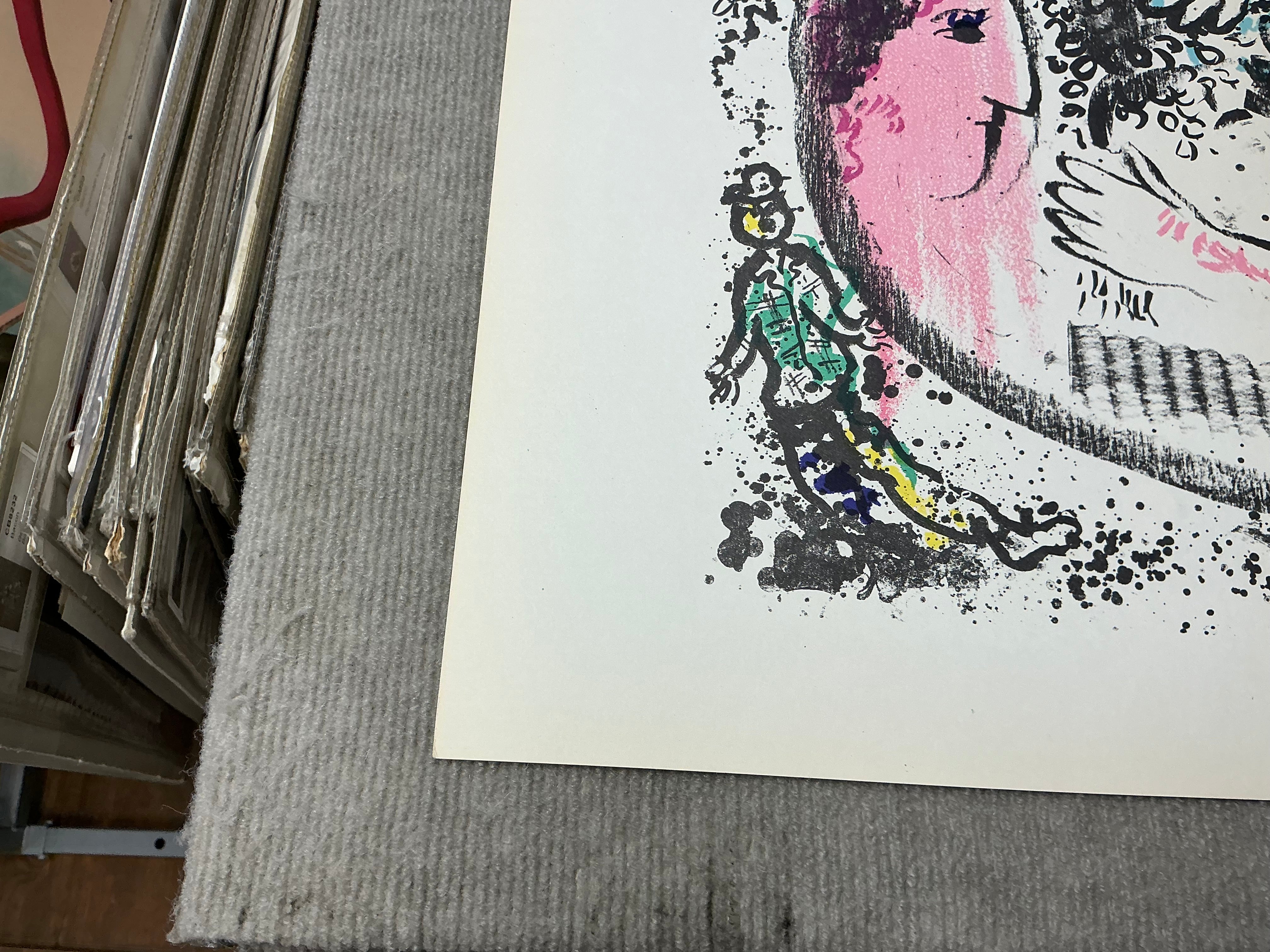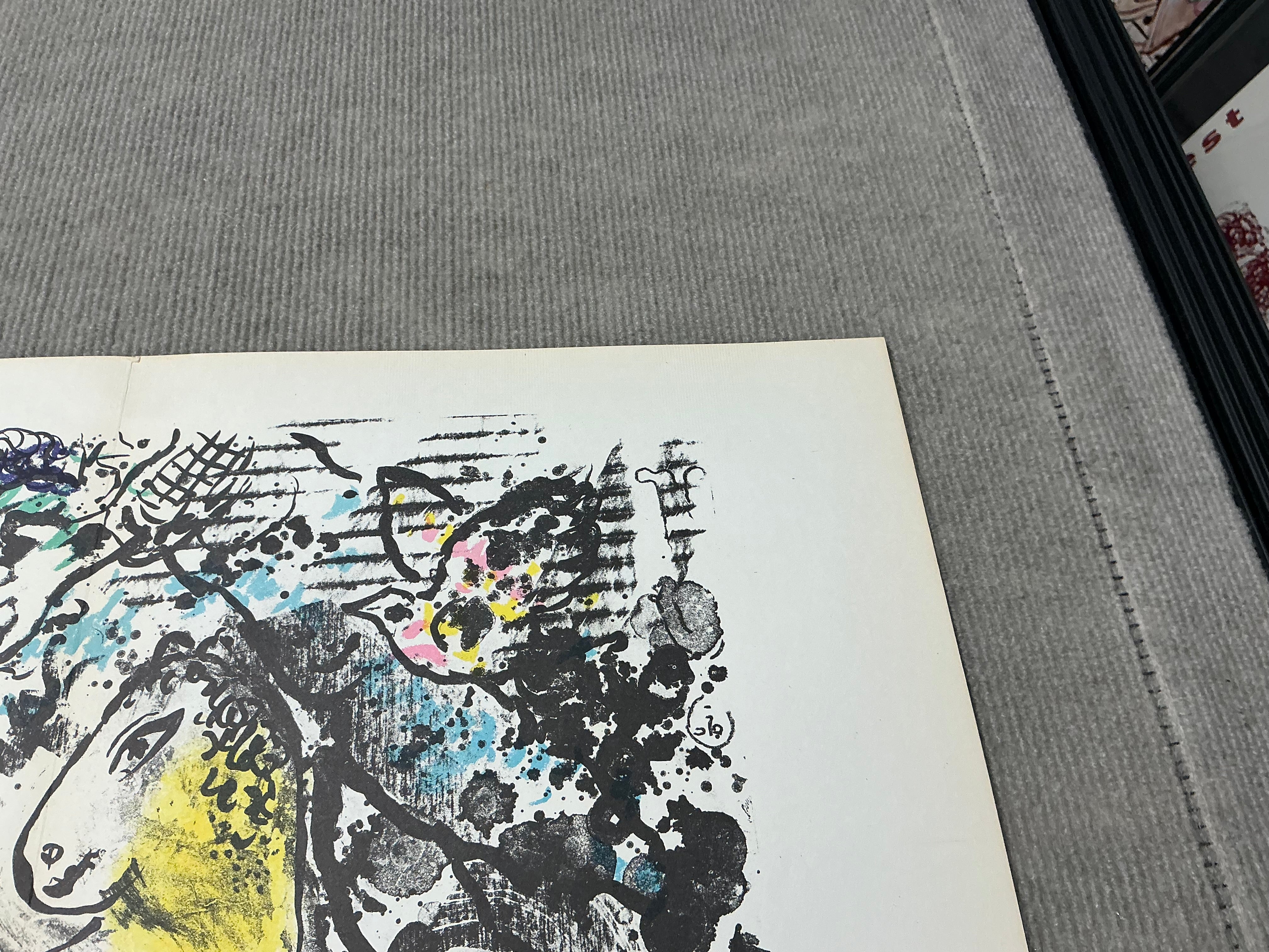 The artwork is a vibrant and colorful composition, dominated by pink and yellow hues. It depicts a dreamlike scene with a horse's head, a bird, and hands reaching out to a person lying on her side. This lithograph captures the whimsical and emotive essence of Chagall's style, blending surreal elements with vivid colors to evoke a sense of wonder and introspection.