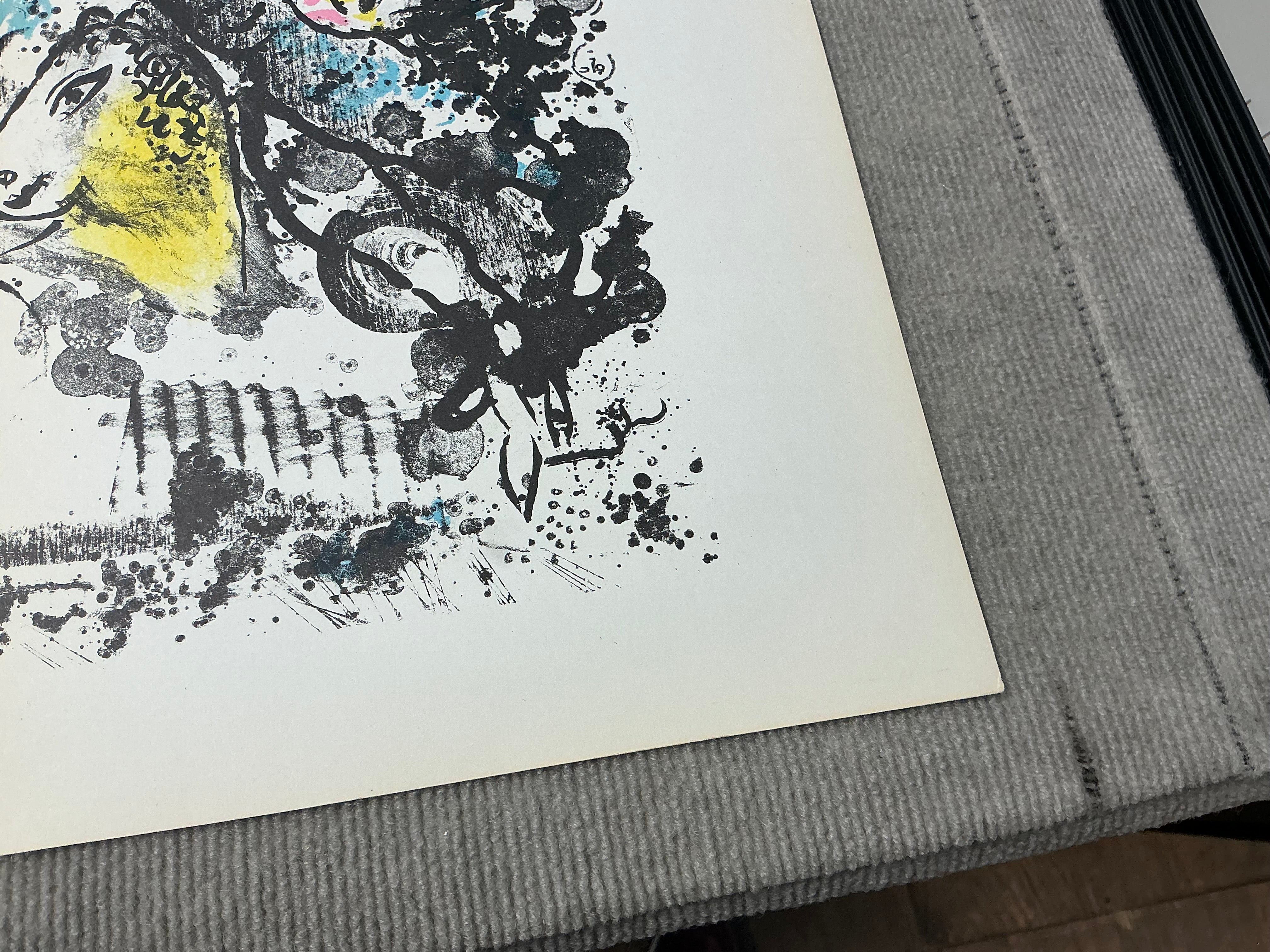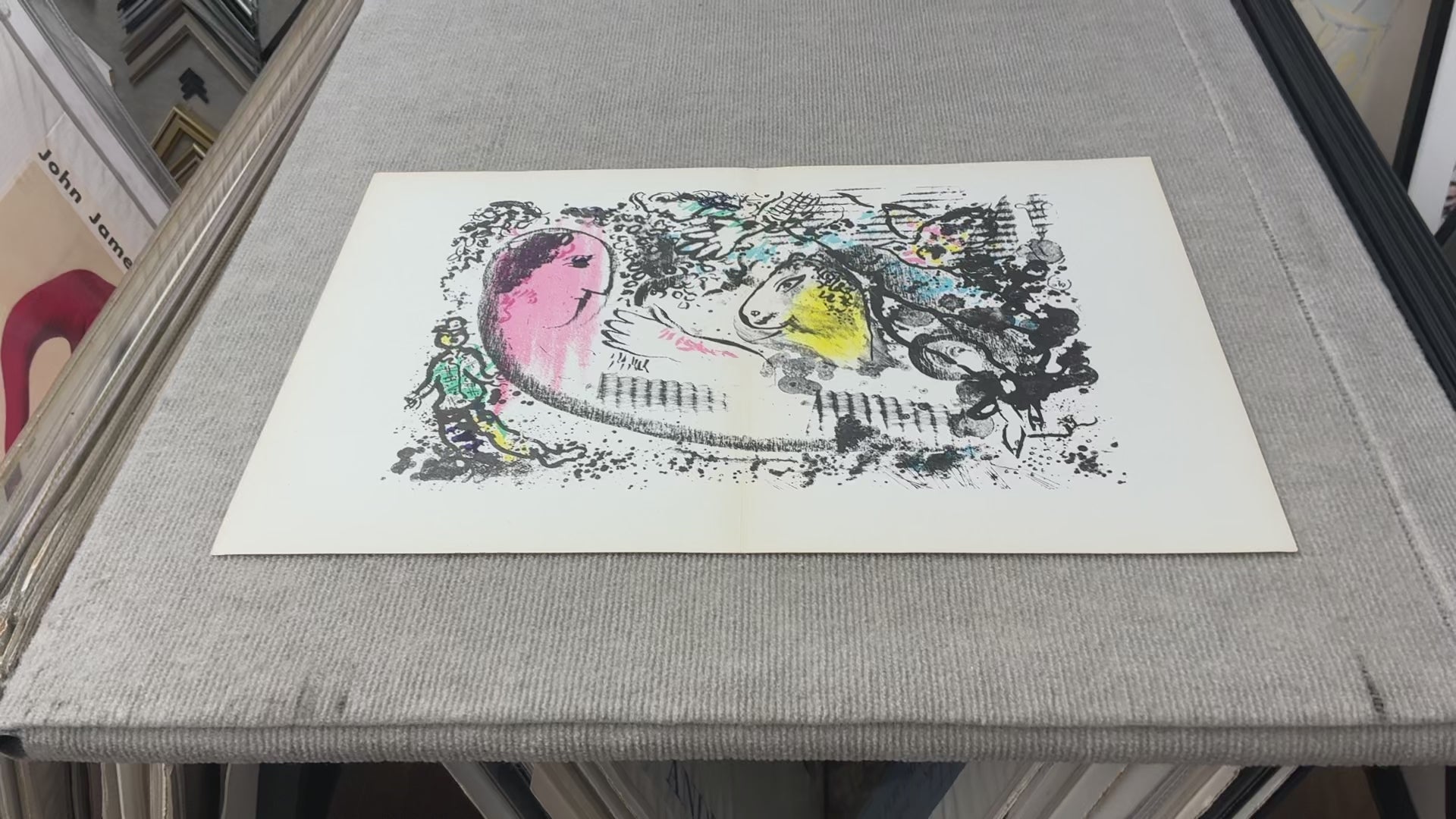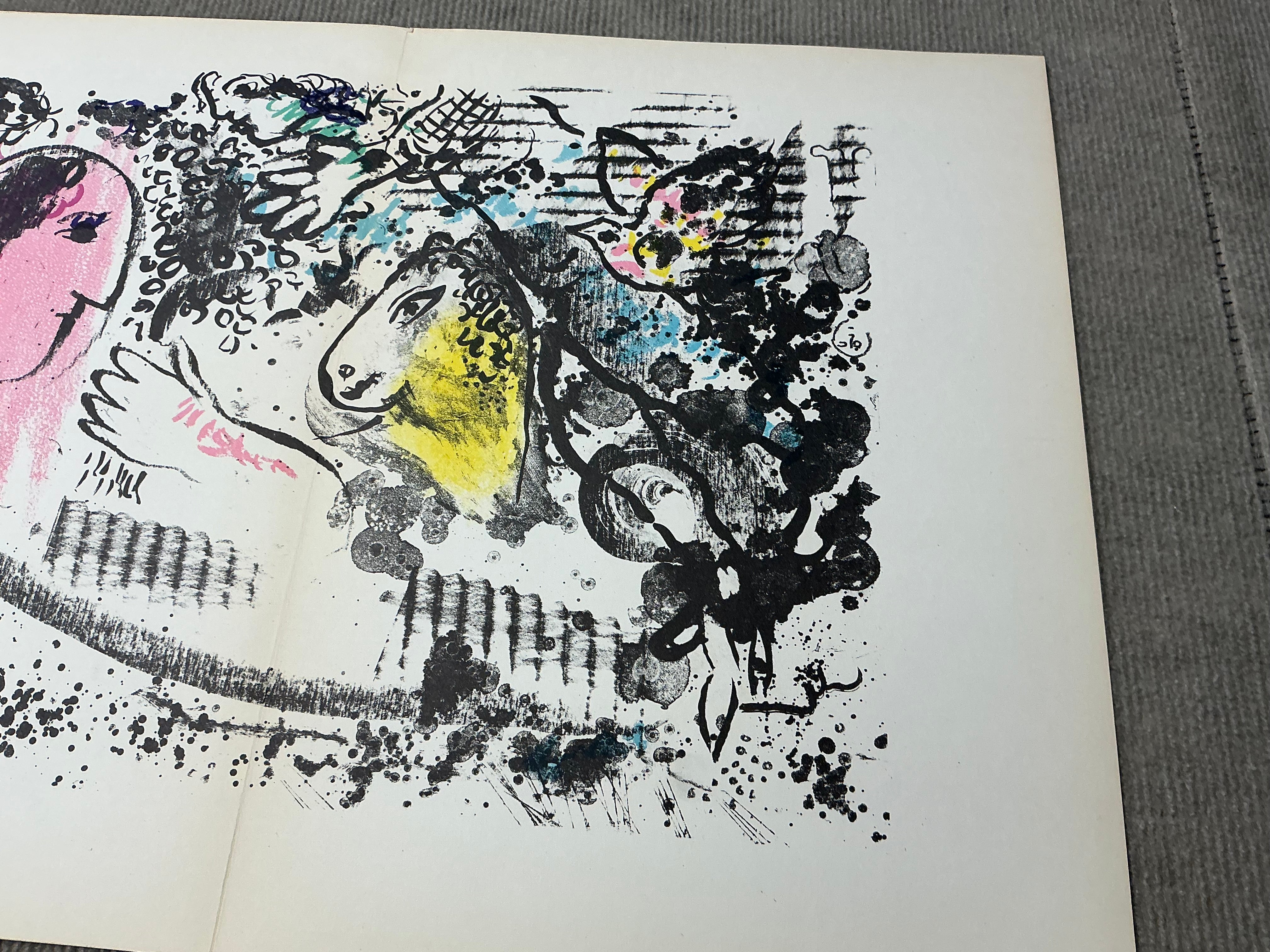 The artwork featured on pages 4 and 5 of Derrière le Miroir No. 182 (1969) by Marc Chagall is titled "Reverie". This double-page lithograph presents a dreamlike composition, reflecting Chagall's signature style with fantastical elements such as a horse, bird, and human figures. The piece, like much of Chagall’s work, draws on his deeply personal memories and imagination, combining whimsical imagery with vibrant colors to create a timeless and emotional vision​