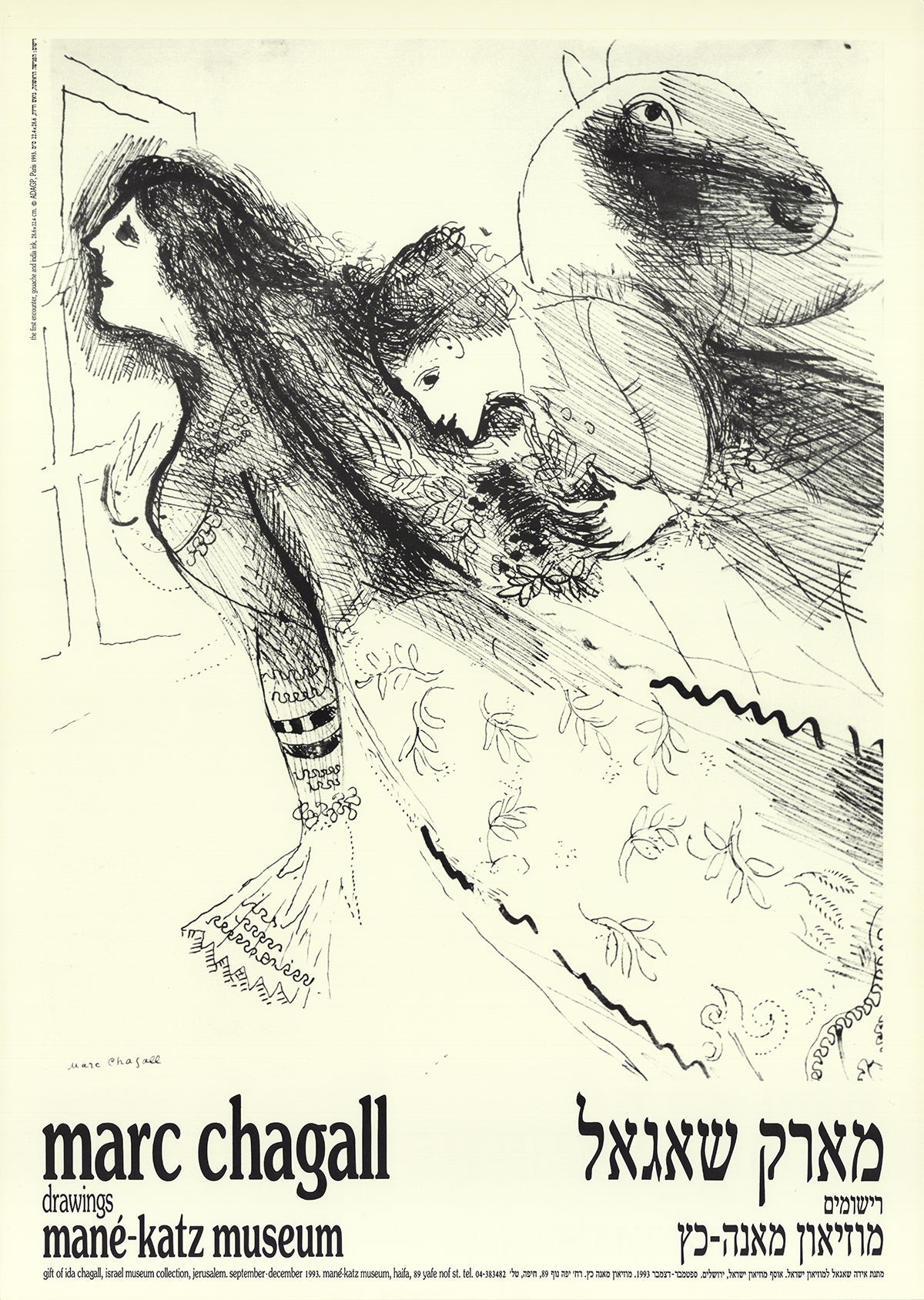 "The First Encounter" is a poster created for an exhibition held at the Israel Museum of Art. This exhibition poster, designed to promote a collection of Marc Chagall’s works, reflects his deep connection to Jewish culture and history, themes that are central to much of his art.