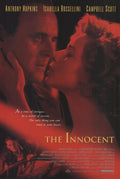 Additional Details: Original poster for the 1995 film starring Anthony Hopkins, Isabella Rossellini and Campbell Scott. Unfolded. "The Innocent" is a 1993 drama film directed by John Schlesinger, based on the novel by Ian McEwan. Set in Cold War-era Berlin, the story follows Leonard, a young British scientist played by Campbell Scott, who gets involved in a complex and dangerous affair with Maria, portrayed by Isabella Rossellini, the wife of a prominent East German activist. The film explores themes of espionage, betrayal, and moral ambiguity against the backdrop of political tension and personal conflict. It's noted for its atmospheric portrayal of divided Berlin and the moral dilemmas faced by its characters.