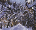 Additional Details: "Linden Avenue, Germany" is a 2009 offset lithograph by artist William Krammisch. The print measures 17 x 17.75 inches (43.18 x 45.085 cm) and is unsigned. The image size within the print is 14.25 x 17 inches (36.195 x 43.18 cm). The edition size of this lithograph is not specified. The artwork is in near-mint condition, exhibiting only very light signs of handling.