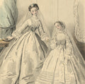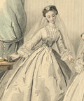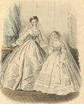 Additional Details: This vintage color lithograph page from the Journal des Demoiselles II (Ladies Diary), printed in 1863, provides a charming glimpse into the fashion and societal norms of the mid-19th century. The Journal des Demoiselles was a popular French magazine catering to young women, offering insights into the latest trends in fashion, etiquette, and lifestyle. The detailed and elegant illustrations were a hallmark of the publication, reflecting the high standards of design and artistic quality of the period.