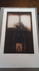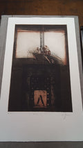 Additional Details: This untitled work by Fred Karl Dahmen, printed on a large sheet of heavy textured paper typical of etching, showcases his mastery in creating depth and contrast through abstract forms. The composition predominantly features dark tones, creating a moody and intense atmosphere. At the top of the image, a window-like opening introduces a source of light that contrasts with the darker areas below, adding a dynamic interplay of light and shadow. In the lower part of the print, a lighter shade of brown emerges, adding a subtle warmth to the otherwise dark palette. Within this section, a diagrammatic element appears, resembling an upside-down letter V, alongside a representation of a metal plate secured with several bolts. This element suggests an industrial or mechanical motif, evoking the idea of something welded or constructed.