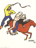Additional Details: First edition advertising poster by Alexander Calder for Amnesty International in 1977. Artists for Amnesty, a series of art posters created by 15 world renowned artists to focus on Amnesty International's Prisoners of Conscience Year 1977, was exhibited between February and March of 1977 in the Washington Place windows of New York University's Grey Art Gallery. The poster features a powerful image: a man holding a whip and a horse with two men who seem to be escaping. This dramatic scene encapsulates themes of oppression, escape, and the struggle for freedom, reflecting the core mission of Amnesty International. Calder's use of bold lines and vivid colors brings a dynamic energy to the composition, making the poster not only a striking piece of art but also a compelling statement on human rights.