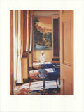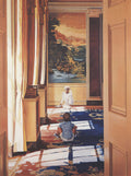 Additional Details: In this surrealist composition, a young boy in a striped shirt sits in a doorway, gazing at a mural painted on a nearby wall. The mural depicts a river winding through lush mountains, where below, another boy dressed in Aladdin-style white garb, barefoot and shielding his eyes, appears captivated by the scene. Light streams in from a large window, inviting the boy into this dreamlike landscape. The artist captures a moment where two boys from different worlds seem to meet, reflecting both the cultural divergences and the shared beauty of the realms they inhabit.