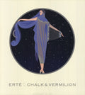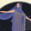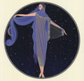 Additional Details: This enchanting reproduction titled Moonlight by Erté captures the serene beauty of a woman set against a celestial backdrop, dressed in delicate fabric that seems to announce the arrival of nightfall. The woman is adorned in flowing garments of dusk blue and light grey, their soft, ethereal tones perfectly complementing the tranquil, starry background.