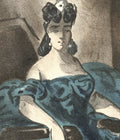 Additional Details: Les Femmes dans l'Atelier de Couture by Lena Leclercq shows a seated woman in an exquisite dress that reveals her shoulders and arms, cascading elegantly to her feet. She wears a head dress adorned with jewelry as the centerpiece, embodying both sophistication and grace. The composition highlights the elegance and intricate details of haute couture, capturing the essence of high fashion with a refined and opulent touch. From Verve Edition 1939 Volume II Magazine 5/6